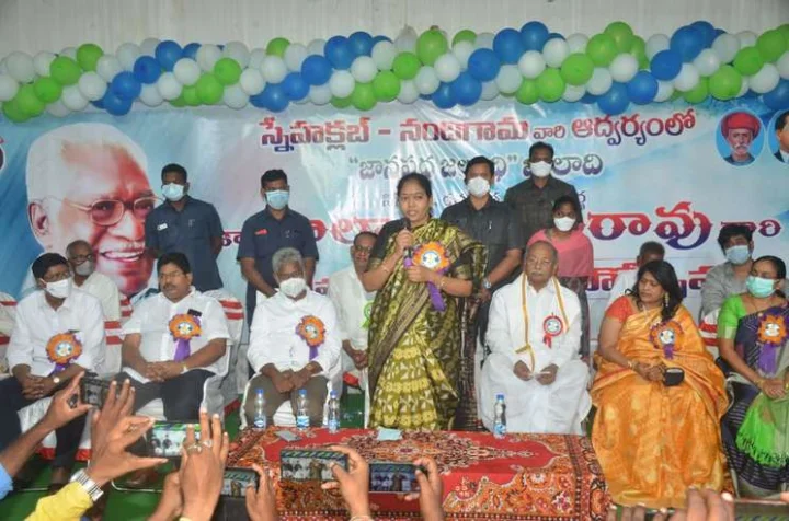 ఆమెతో పాటు మాజీ మంత్రి వసంత నాగేశ్వరరావు, ఎమ్మెల్యే మొండితోక జగన్ మోహన్ రావు, ఏపీ ఎఫ్ డీసి చైర్మన్ అరుణ్ కుమార్ జాలాది చిత్రపటానికి పూలమాలలు వేసి నివాళులు అర్పించారు