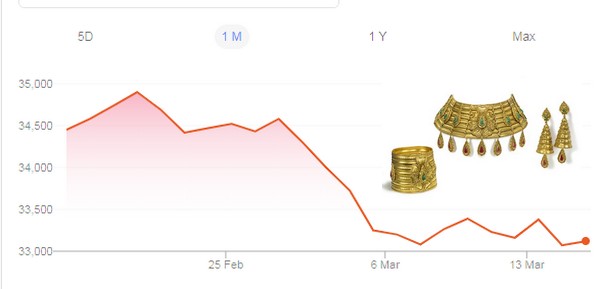హైదరాబాద్లో 10 గ్రాముల 24 క్యారెట్ల బంగారం ధర రూ.32,090 ఉండగా, 22 క్యారెట్ల బంగారం ధర రూ.30,560గా కొనసాగుతోంది. కిలో వెండి ధర రూ.41,100కి తగ్గింది. మరి మార్చి మొత్తం ఇదే ట్రెండ్ కొనసాగితే పది గ్రాముల బంగారం ధర 30,000లోపు వచ్చే అవకాశం ఉండటంతో మధ్యతరగతి ప్రజల ఎదురుచూపులు కొనసాగుతున్నాయి.