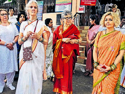 నుదుటన బొట్టు.. చేతి నిండా గాజులు.. ఒంటిని పూర్తిగా కప్పేస్తూ చీరెలు కుట్టుకుని మహిళలు .. సాంప్రదాయబద్ధంగా పూజలు.. శ్రీకాళహస్తిలో మహిళలు ఇలా దర్శనమిచ్చారు. ఇవి భారతీయ మహిళలకు ఉండే సహజలక్షణమే కదా. ఆలయానికి వస్తే ఇలాగే కదా వస్తారు అనుకుంటాం. కానీ అలా వచ్చింది. ఇందులో కొత్తేముంది అని అనుకుంటున్నారా.. భారతీయ మహిళలు కాదు. విదేశీ వనితలు..