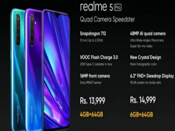 మొబైల్స్ తయారీదారు సంస్థ రియల్మి భారత మార్కెట్లో రియల్మి 5 ప్రో పేరిట కొత్త స్మార్ట్ఫోన్ను విడుదల చేసింది. 4జీబీ ర్యామ్, 64 జీబీ స్టోరేజ్ వేరియంట్ ఫోన్ ధర రూ.13,999 ఉండగా, 6జీబీ ర్యామ్, 64 జీబీ స్టోరేజ్ వేరియంట్ ఫోన్ ధర రూ.14,999గా ఉంది.